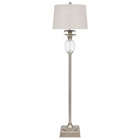 Create a seaside vibe with a touch of luxe with this Pineapple shape floor lamp. The antique silver resin base plus the clear glass cut pineapple is finished off with a grey linen tapered drum shade.