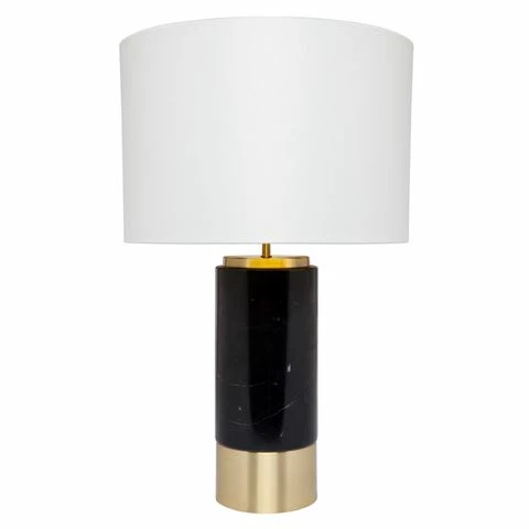 Divine black marble table lamp sitting proudly on a gold base with white linen shade with gold reflective pvc lining.