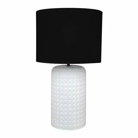 Add gorgeous texture to your interiors with the Patronga table lamp. Featuring a white woven rattan patterned base in a matt ceramic finish contrasted by a black linen look drum shade, creating a cool modern vibe. This well-proportioned lamp is perfect for bedside lighting or living room luxe.