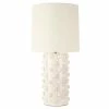 - Crafted in ceramic and topped with a white faux linen tapered shade