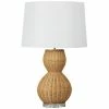 The Sorab Lamp boasts a hand painted floral pattern on a cracked and natural base with a white shade.