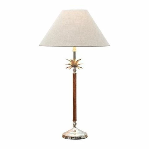 Opt for a bit of playfulness in your interior space with this pine-inspired lamp. Featuring a nickel and wood base and a natural linen shade, it’s the perfect piece to accent your mantle or bedside table.