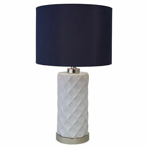 Texture is the defining feature of this eye-catching table lamp from Shaynna Blaze’s new collection. The hatched pattern on a glossed white ceramic base is offset by a nickel trim and hardware and a generous white linen shade.