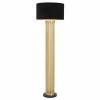 Its airy cylindrical base consists of metal rods with an antique brass finish. The fixture comes complete with a round black drum shade with a gold-coloured inner for extra warm light.