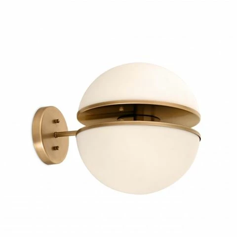 The fixture features an antique brass finish and the lampshade is formed by two half spheres from white glass with an open space in between.